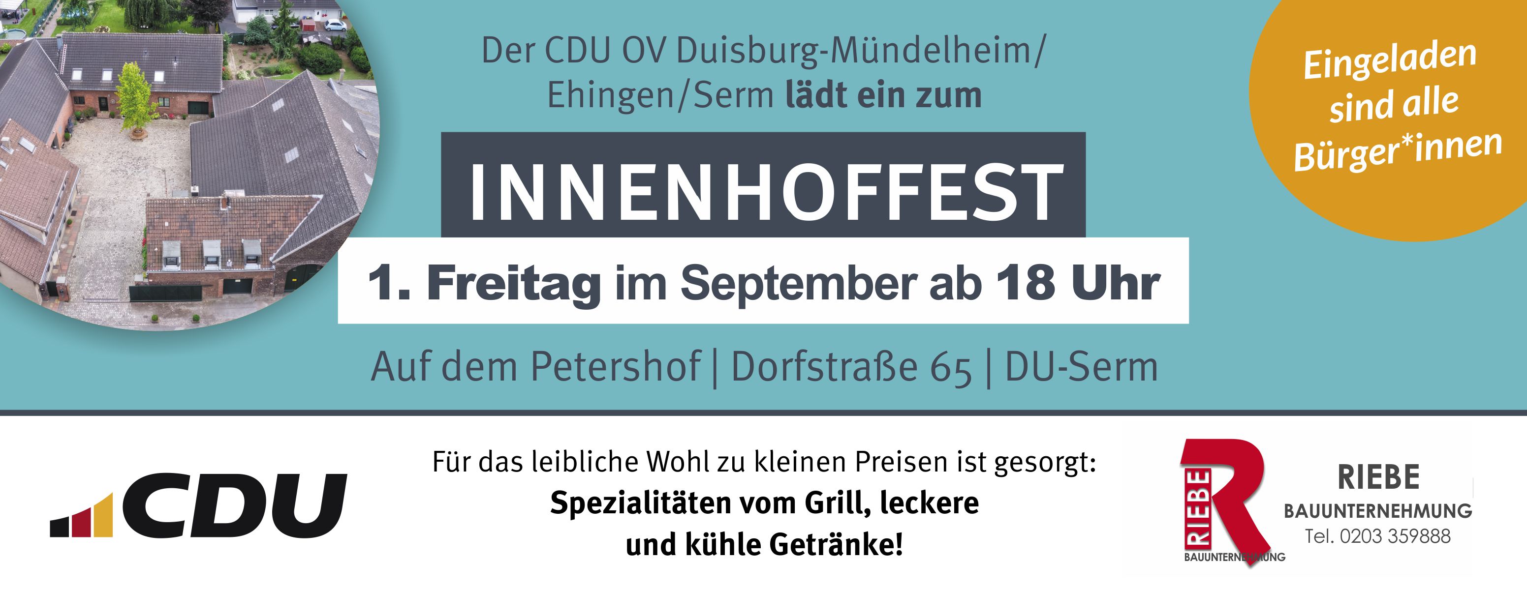 Am ersten Freitag im September ( 06.09.) lädt der CDU Ortsverband Mündelheim, Ehingen, Serm, alle Bürgerinnen und Bürger, zum traditionellen Hoffest auf dem Petershof (Dorfstr. 65) ein. Live-Musik, Spezialitäten vom Grill und Getränke zu kleinen Preisen sorgen für einen schönen und geselligen Abend. Wir freuen uns auf viele nette Gespräche.